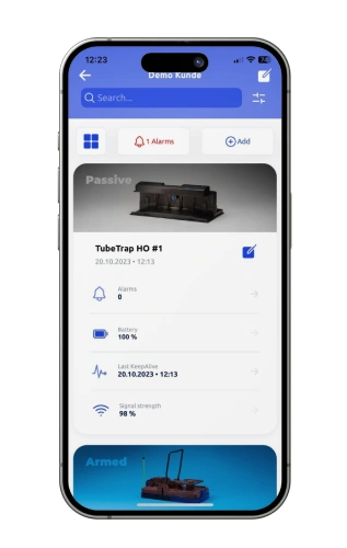 Wenn auf AKTIV gestellt, schlägt die Tubetrap zu und fängt aktiv und tierschutzkonform Nager. Dies ist auch unsere Empfehlung, da für die meisten Standards gilt: „Fangen ist auch eine Form des Monitoring“. Können Sie jedoch am Wochenende oder zu Feiertagen die 24 Stunden Kontrollrythmen (TSchG) nicht einhalten, können Sie natürlich auch die Monitoringfunktion einplanen und vollständige Sicherheit genießen. Der Fang wird in der App mit einem roten Informations-Icon angezeigt.