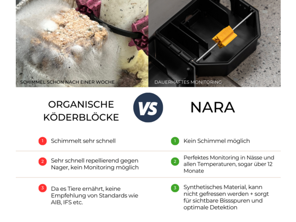 Nara® was developed with and for the food industry and professional pest control. Organic bait varieties mold quickly, especially if they come into contact with water or moisture outdoors, which is almost unavoidable. After only a few weeks, they become very moldy and are no longer attractive to rodents, but the opposite: the rodents will never go to the station again. Nara® cannot mold and is still a perfect monitoring tool after more than a year. It is not uncommon for Nara® Bloc or Stic to still show fresh bite marks when checked after more than 12 months. In addition, Nara also can not be eaten by harmful insects, such as by beetles, cockroaches, ants and others.