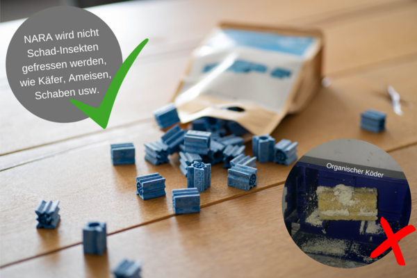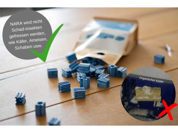 Compared to organic baits, NARA® is not eaten by insect pests such as beetles, ants, cockroaches etc.